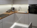 Z salonu dębowe schody prowadzą na piętro, gdzie znajduje się kuchnia w eleganckiej, funkcjonalnej zabudowie z wyjściem na balkon. Na piętrze są jeszcze dwa pokoje i łazienka.