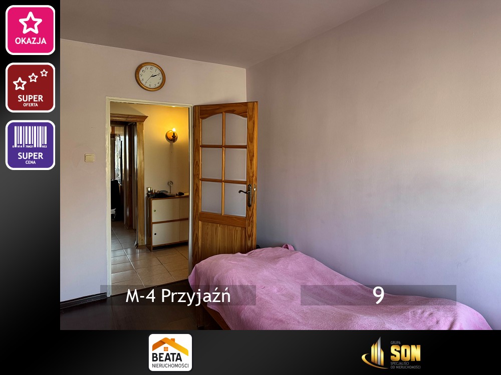 Mieszkanie składa się z salonu z dużym balkonem, dwóch pokoi,oddzielnej kuchni z oknem, przedpokoju, łazienki i WC. Na podłogach w pokojach panele, pozostałe podłogi pokryte płytkami. Drzwi wejściowe wymienione. Na ścianach gładzie. Na balkonie tynk mineralny i wykafelkowana podłoga.