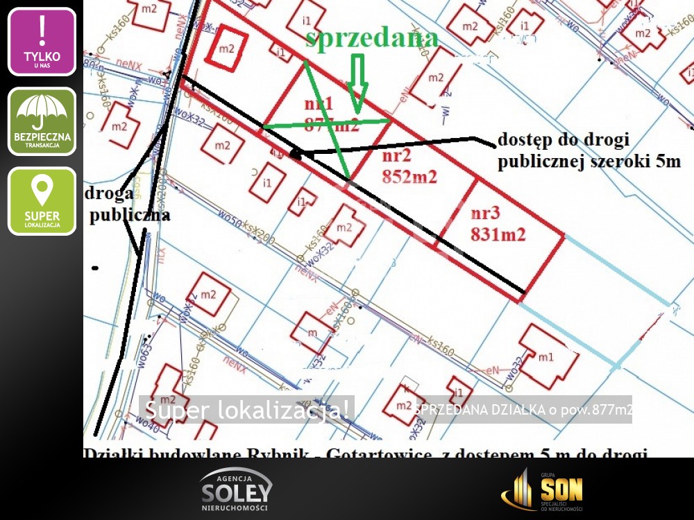 DO SPRZEDAŻY TAKŻE DWIE INNE DZIAŁKI O POWIERZCHNI: 852m2 W CENIE 159 tys.zł ORAZ 877m2 w cenie 165 tys.zł.